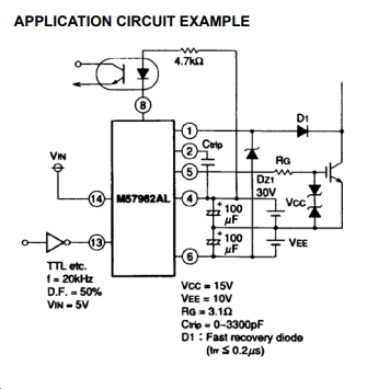 M57962al sử dụng nhiều trong mạch kích igbt vì tính tiện dụng tích hợp sẵn chỉ thêm vài linh kiện đơn giản để cấp nguồn là mạch có thể hoạt động độc lập việc còn lại chỉ là thiết kế xung để điều khiển